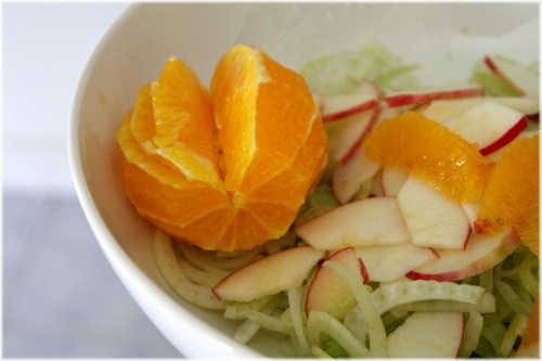 חותכים את ראש השומר (החלק הלבן) לחצי ואז לפרוסות הכי דקות שאפשר. חותכים את התפוח לרבעים, מנקים מהליבה ופורסים דק דק. 'מפלטים' את התפוז: מפשיטים מקליפתו עם סכין, תוך כדי הורדת העור הלבן. אח"כ מפרידים עם הסכין רק את תוך הפלחים ומוסיפים אותם לשומר ולתפוח עם כל המיץ שניתן לסחוט משאריות התפוז.