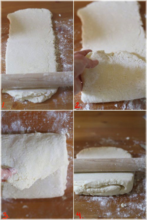 4. מסובבים את הבצק 1/4 סיבוב, כך שיפנה אליכם עם חלקו המראה את הקיפולים ומרדדים שוב.