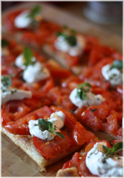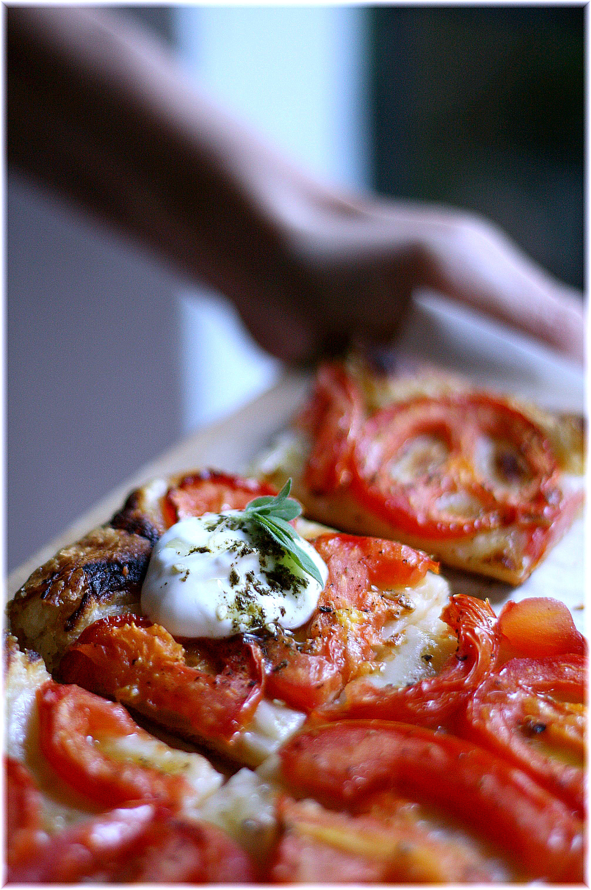 כשמוציאים מהתנור מניחים על קרש גדול ופורסים לריבועים. מניחים מעל לכל רבוע כפית של וגורט, מעט תבלין זעתר וכמה עלים של אורגנו.