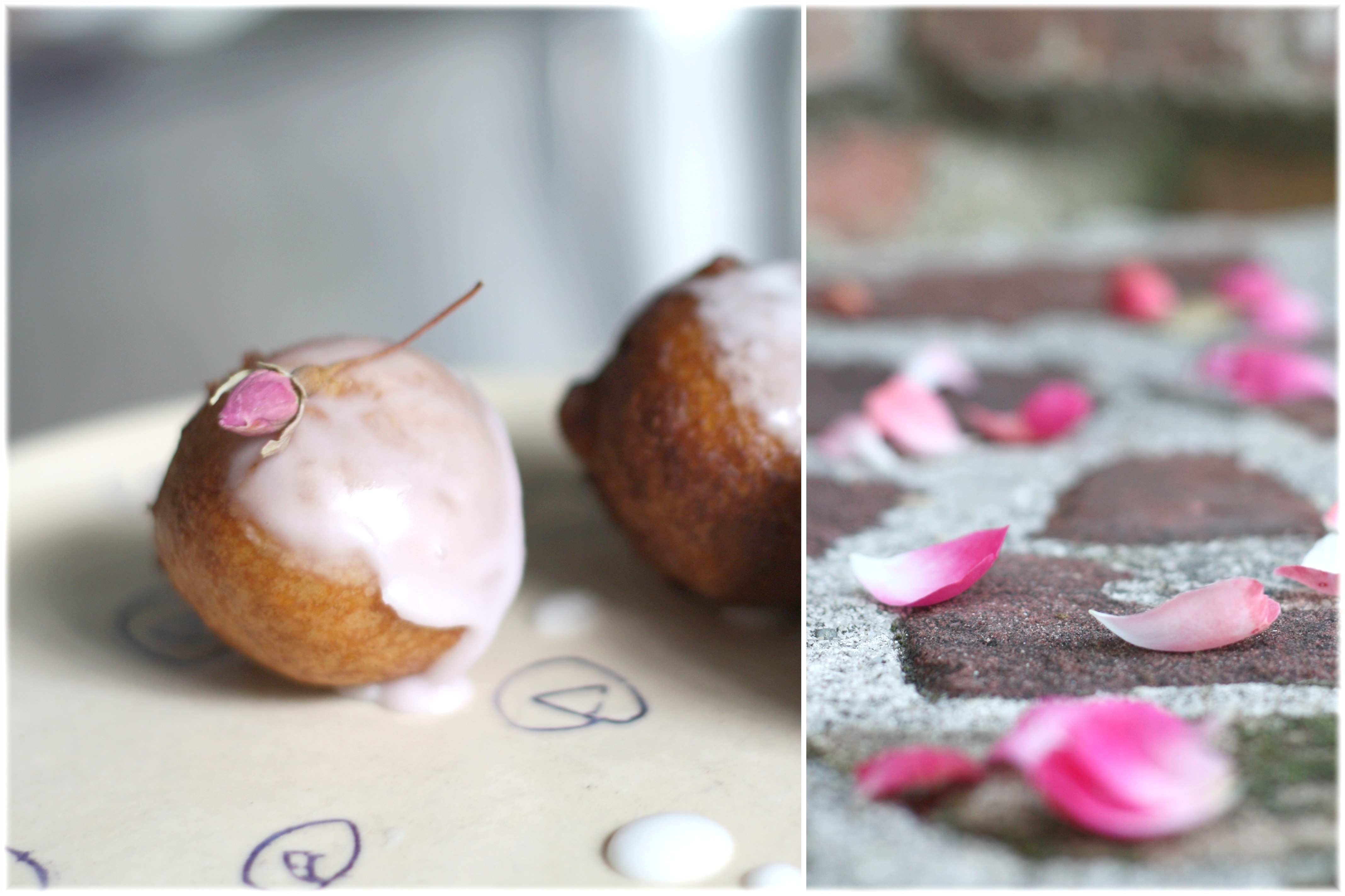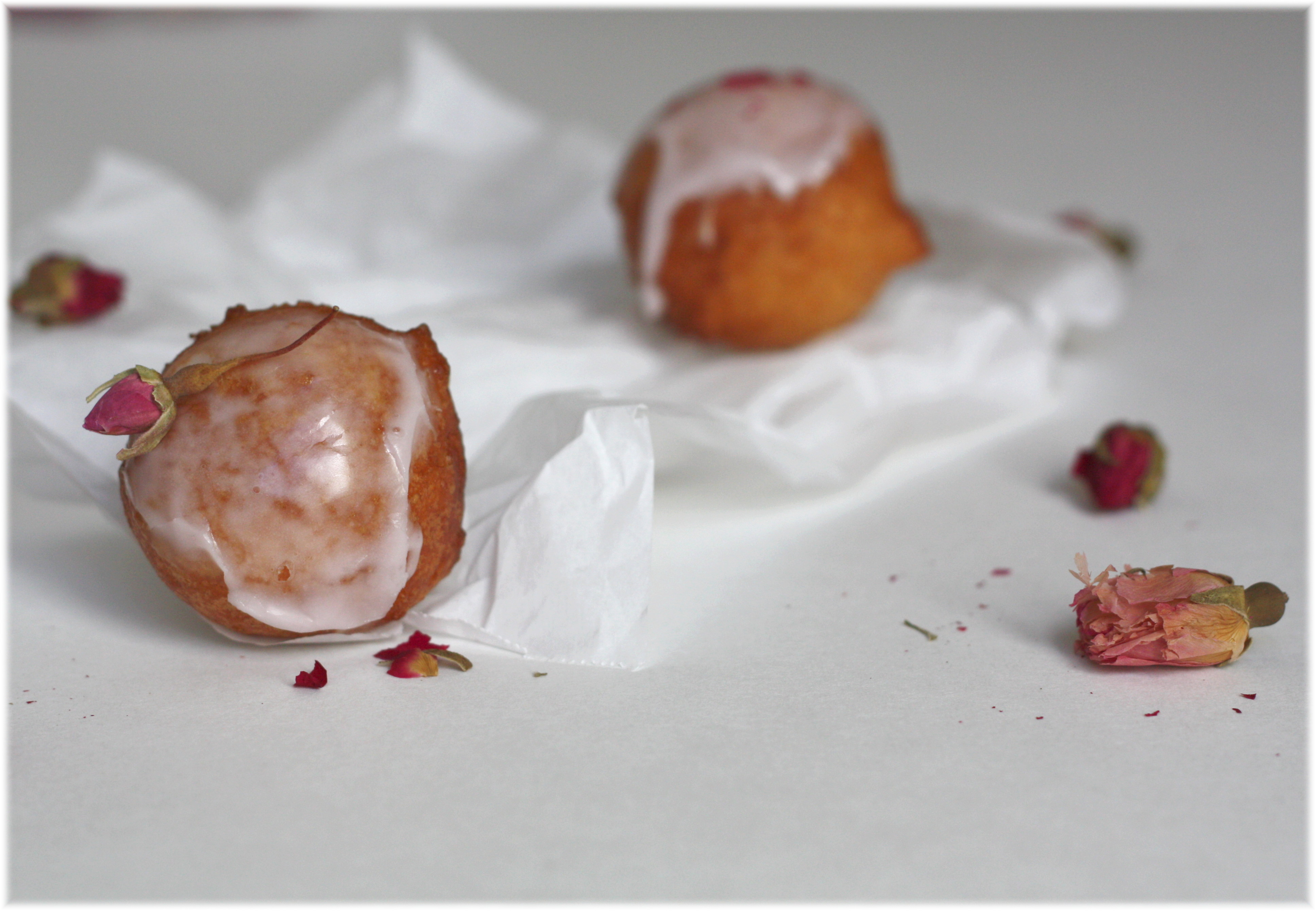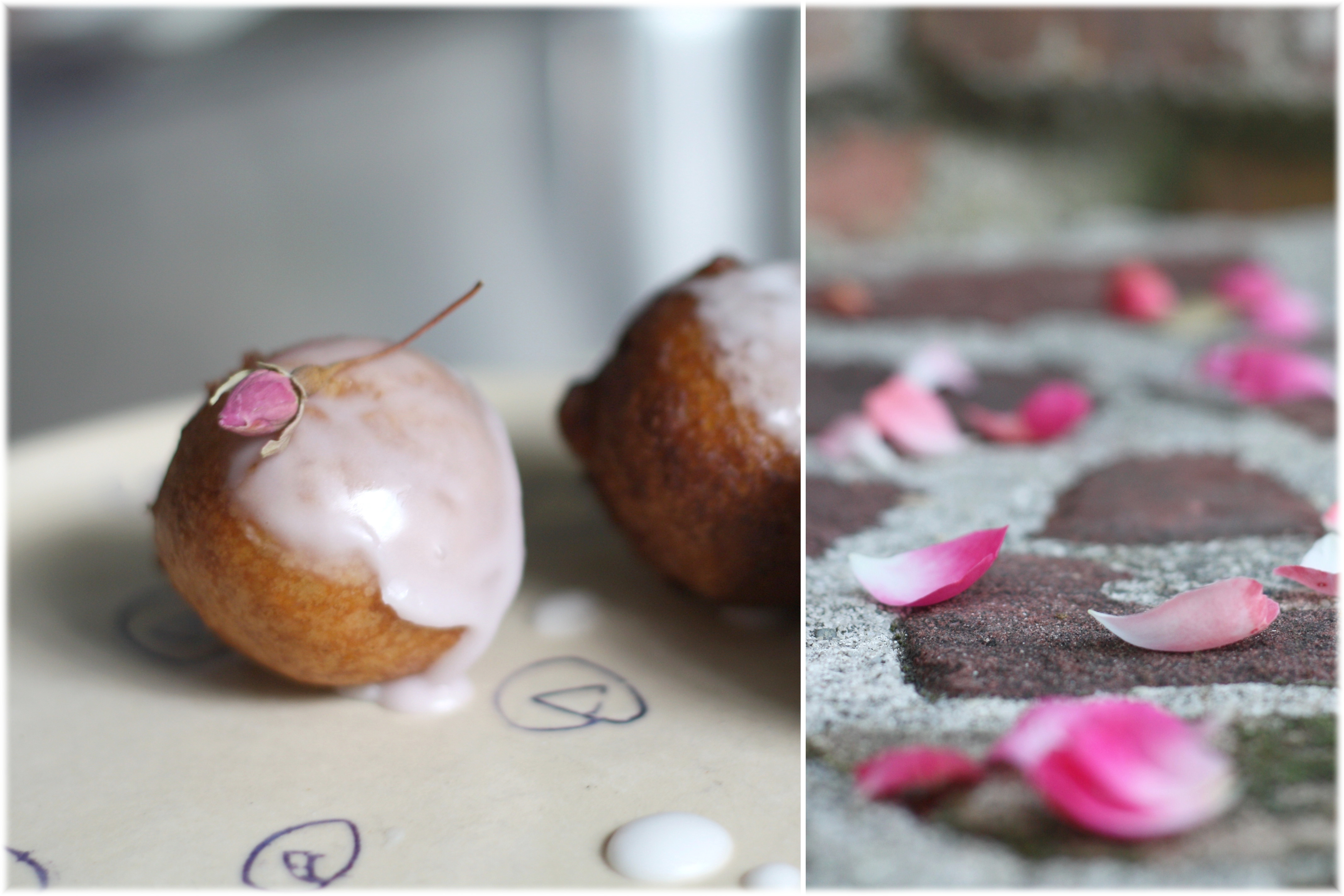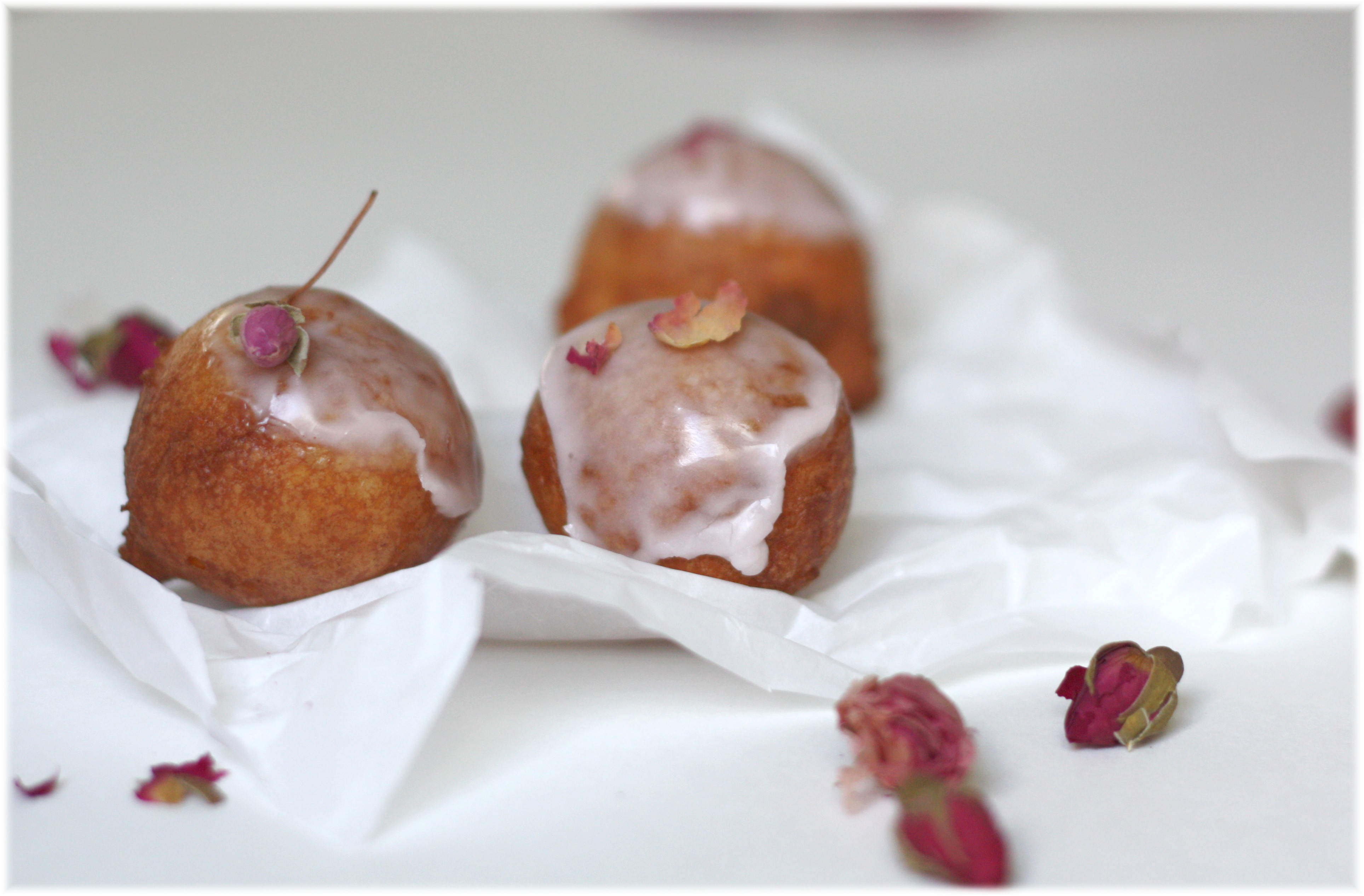 אם בכל זאת רוצים להיות נועזים יותר מאבקת סוכר וריבה, אפשר לשחק קצת עם טעמים חיצוניים. אפשר לגלגל אותן חמות בסוכר וקינמון, לטבול בשוקולד מומס ואז בכל דבר שבא, או להכין זיגוג סוכר. אני הוספתי לבלילת הבצק מעט הל טחון וטיפונת מי ורדים לזיגוג.