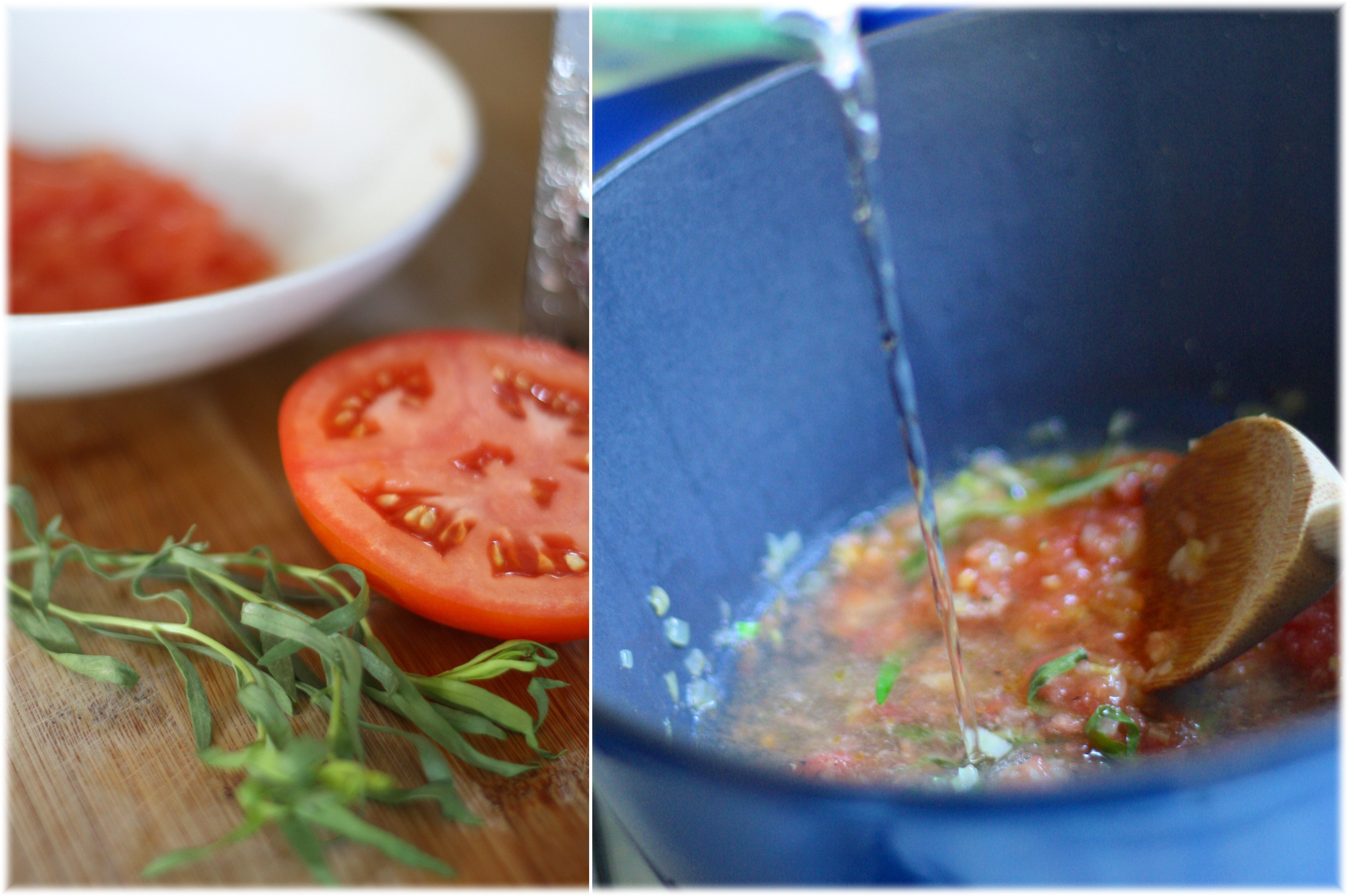 כשהשאלוט רך לגמרי ושקפקף, מוסיפים את העגבניות, הטרגון והיין ומביאים לרתיחה. (אם מכינים מראש, עוצרים בשלב הזה ובעת הצורך, מביאים שוב לרתיחה וממשיכים)