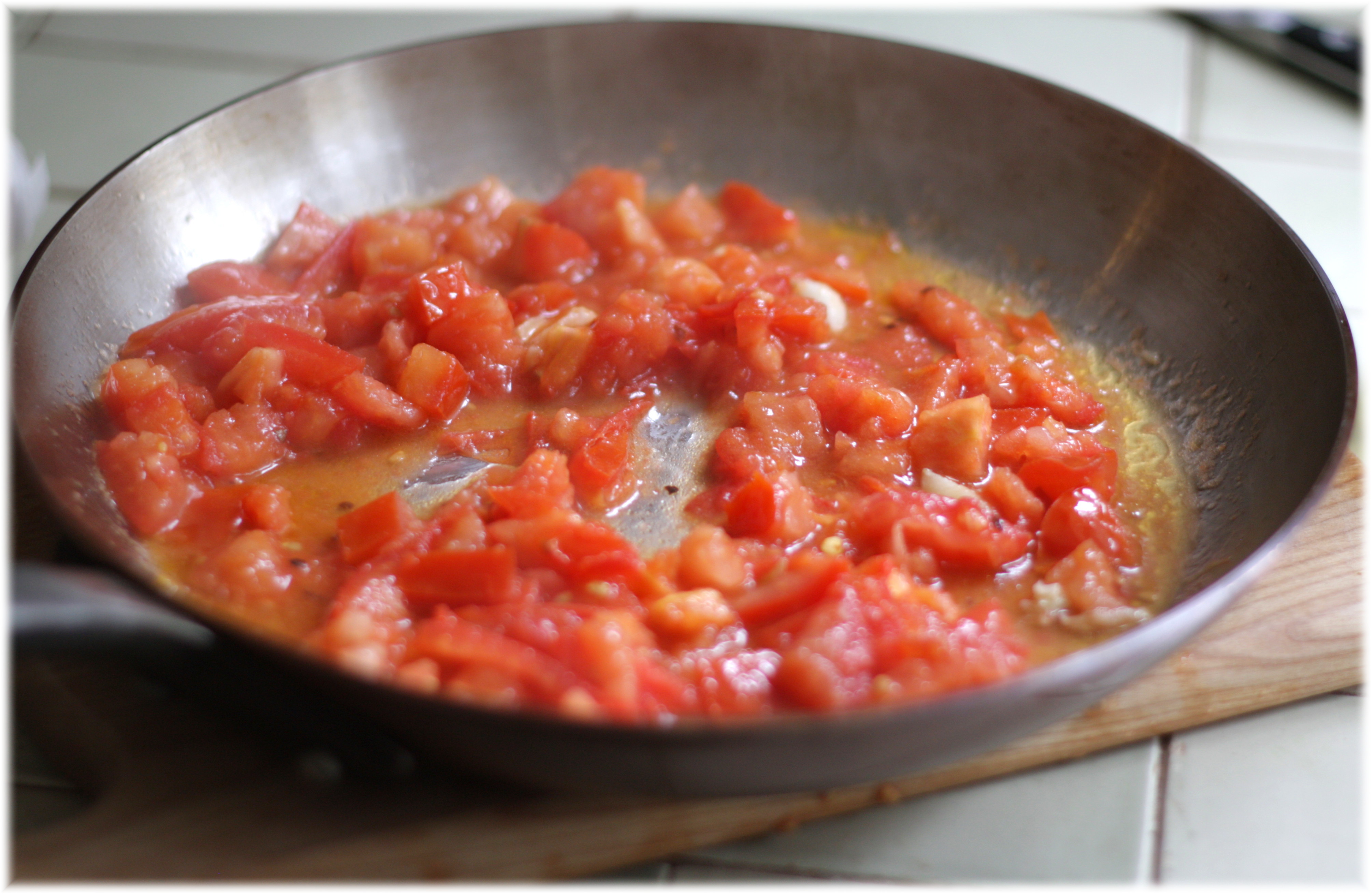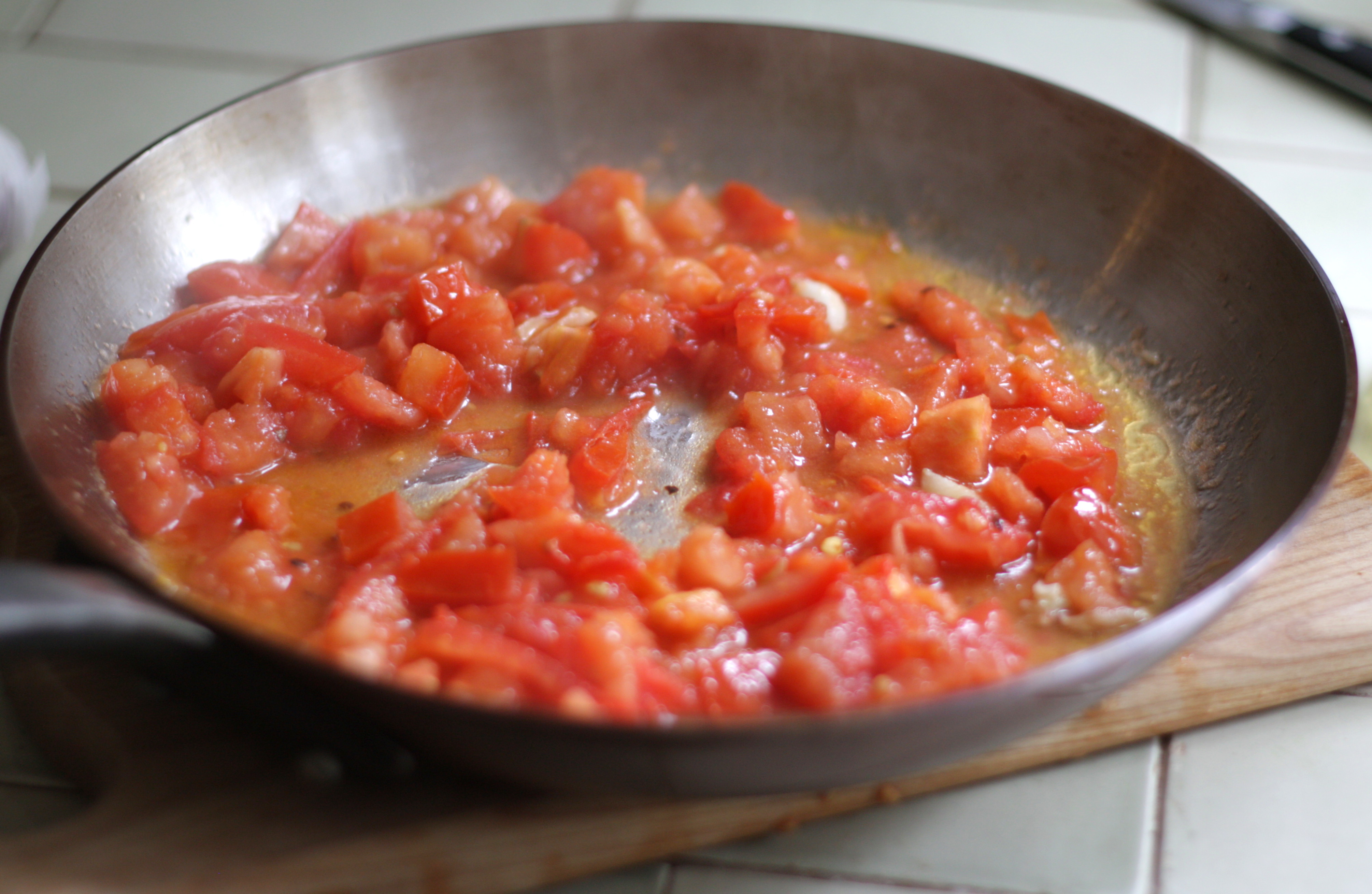 בינתיים – מחממים מחבת עם שמן זית בנדיבות (בערך 1/3 כוס) ושתי שיני שום שלמות שנתתם להם מכה יפה עם הסכין והן קווץ'. כשהשום מתחיל להוציא ריחות של שום- מוסיפים 4-5 עגבניות מגולענות וקצוצות. מבשלים כ-10 דקות עד שהעגבניות מוציאות קצת נוזלים ומתרככות בעדנה. מוסיפים ירוקת ועוד שמן זית בנדיבות וגם מלח ופלפל טרי. מוסיפים את המים ששמרתם מהבישול וגם קצת צ'ילי פלייקס, אם רוצים. מערבבים כמו האיטלקים, עם שני מזלגות מבשלים עד שהנוזלים מתאדים לגמרי. וזהו.