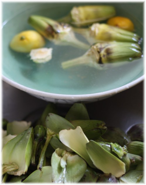 מכינים קערה גדולה עם מי ברז קרים וסוחטים לתוך המים מיץ מלימון שלם- לכאן יכנסן הארטישוקים הנקיים והלימון נועד למנוע מהם להשחיר. הם כנראה ישחירו בכל זאת…