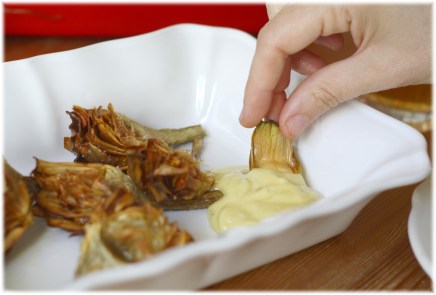 לכן אם אומר לכם שאתם חייבים לטגן את הארטישוקים האלו- האם תאמינו לי? כדאי באמת ובתמים! חובב ארטישוקים אמיתי שטרם טעם אותם מטוגנים, לא יודע שמחת בית השואבה מהי… ארטישוק מטוגן צופן בתוכו עולם של נפלאות- העלים החיצוניים הופכים לדפדפים קריספיים מתפצפצים והלב, כמו שלב ארטישוק יודע להיות- מענג בצורה מופלאה. אם בנוסף גם עמלים דקותיים ומכינים רוטב איולי מפוצץ בשום שילך עם זה, צפויה לכם חויה מרנינה ואולי אף אעז לומר, מרגשת. אם לא בא על האיולי, אפשר סתם כך רק עם מעט מלח או עם רוטב שמן-חומץ, זה שבדרך- כלל מלוה ארטישוקים מבושלים במים.