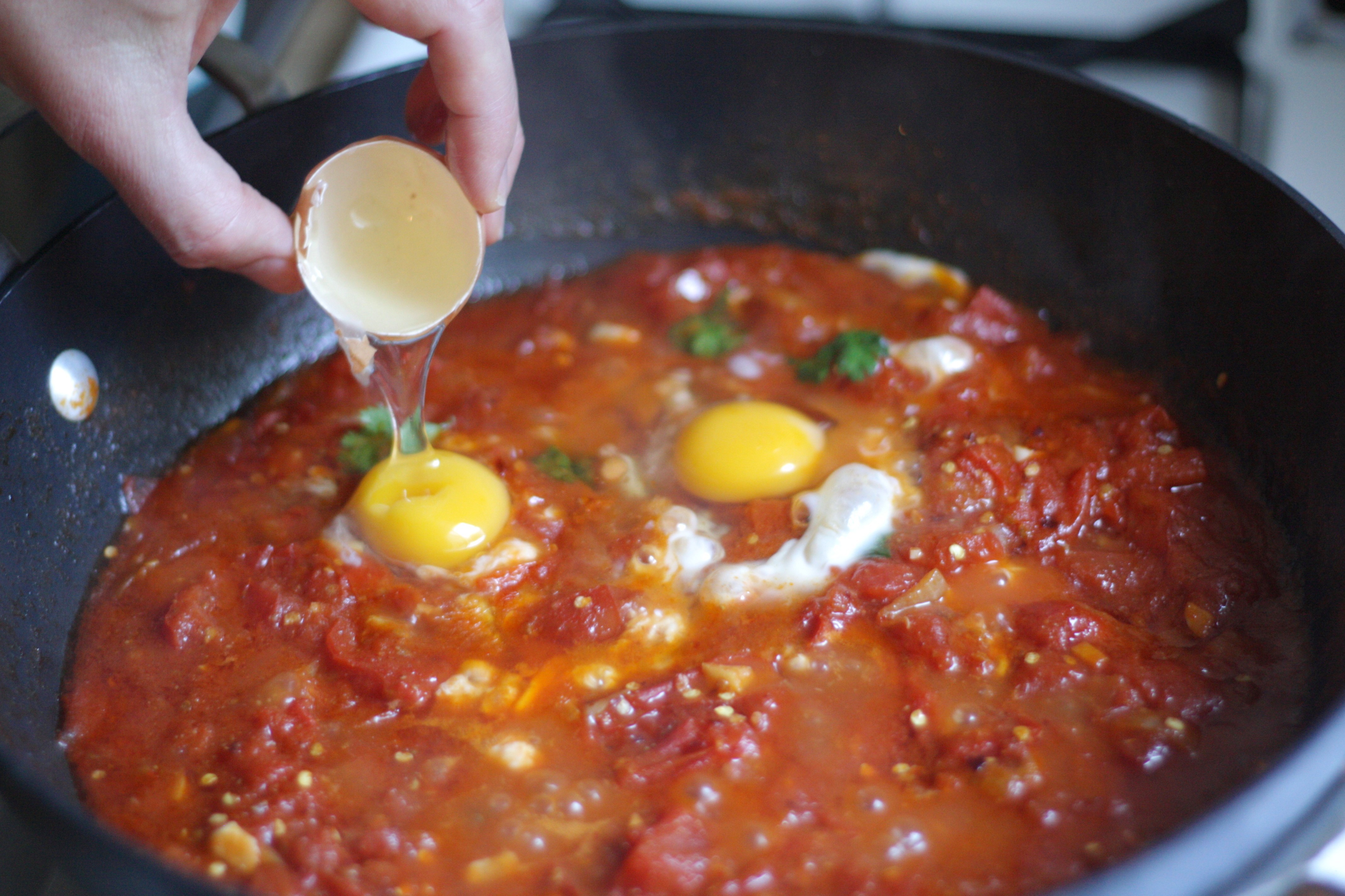 שוברים את הביצים ישירות למחבת החמה, מפזרים עליהן מעט מלח ומכסים. מבשלים כ- 6 דקות או עד לדרגת העשיה האהובה עליכם…כשמוכן העסק, מפזרים מעל את כל הכוסברה ועוד קצת כמון טרי.