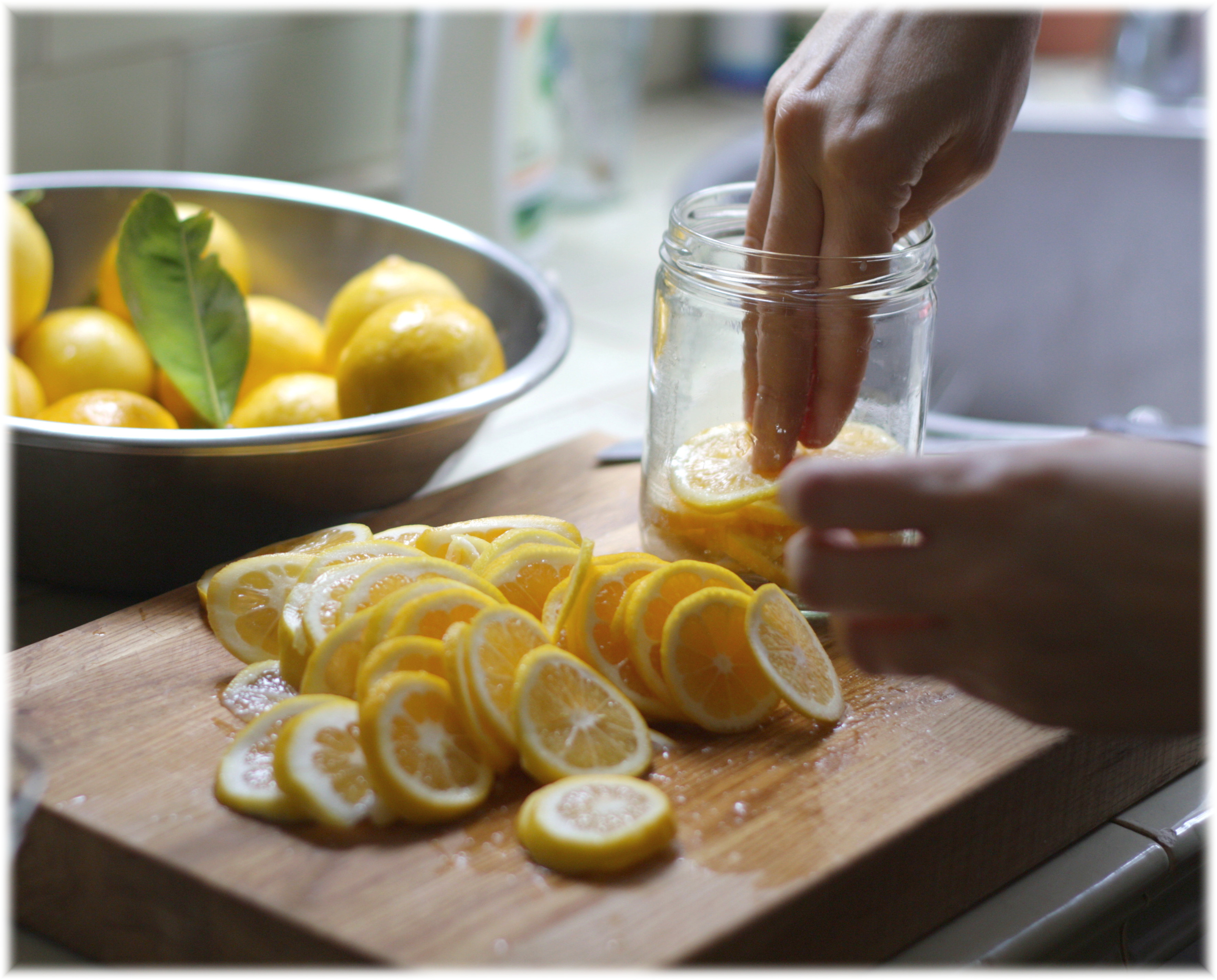 פורסים לימונים לפרוסות דקיקות ככל הניתן ומוציאים גלעינים. מניחים בצנצנת קטנה כל פעם כמה פרוסות וזורים מעל מלח בנדיבות. עם כל 'קומה', לוחצים את הלימונים מטה בכדי שיגירו מיצים. כשמגיעים למילוי הצנצנת, הנוזלים אמורים להיות בערך עד 3/4 מגובהה ואפילו מעל. סוחטים עוד קצת מיץ לימון בכדי לכסות את הפרוסות ומכסים בשכבת שמן-זית דקה. סוגרים היטב ומניחים בצד, במקום מואר, ליומיים-שלושה.