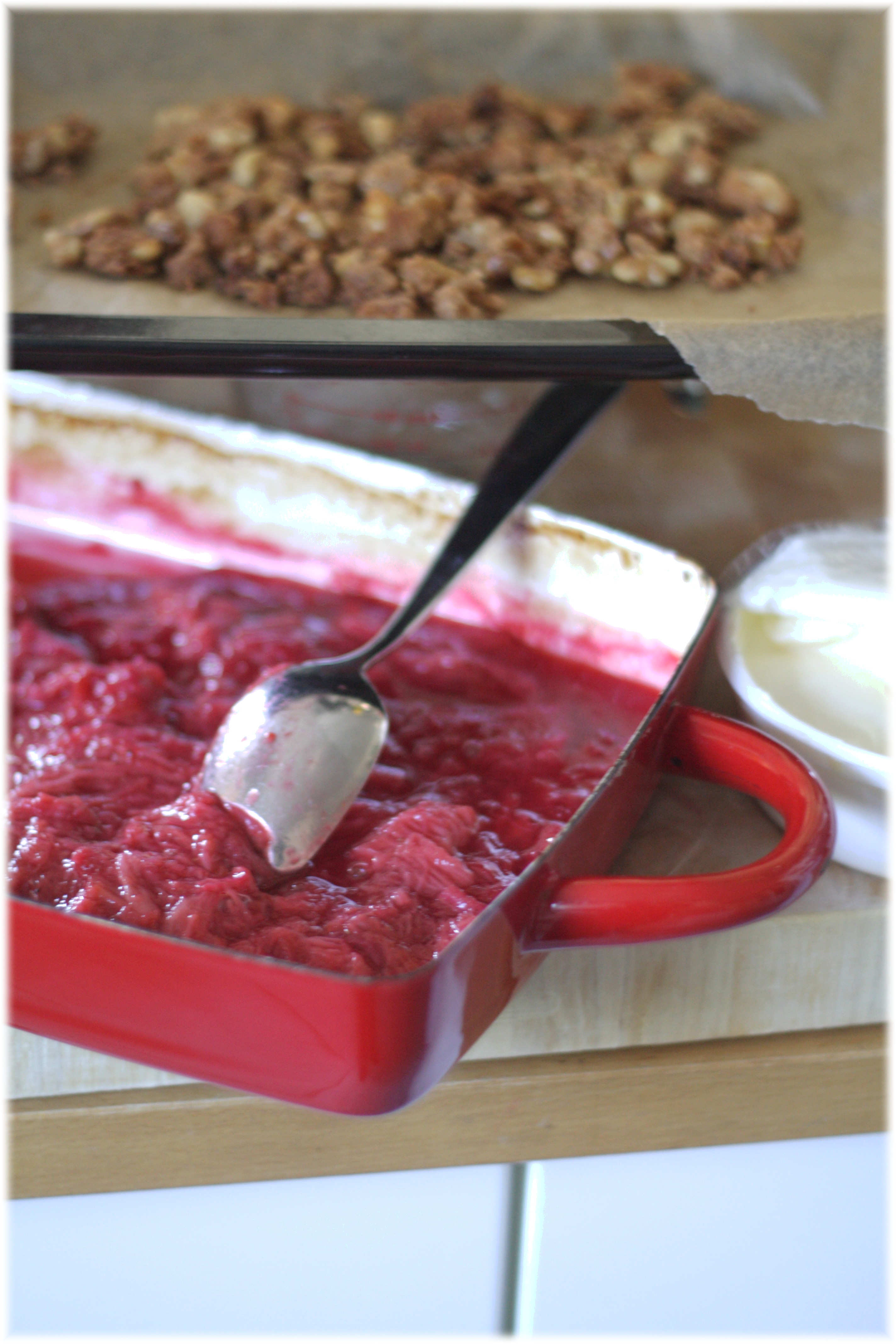 השנה החלטתי להתחכם לקראמבל ולפרק אותו לסך חלקיו. אפיתי את הרוברב עם וגם בלי תותים והכנתי את הפירורים לחוד. כשמשלבים אותם יחד ומוסיפים על זה מעט גלידת וניל, מתקבל קינוח טעים (רך וקראנצ'י ומתוק וחמוץ וקר ונעים), קליל וגם קצת אלגנטי כי בכל זאת, רוברב לא בא כל יום בשנה…