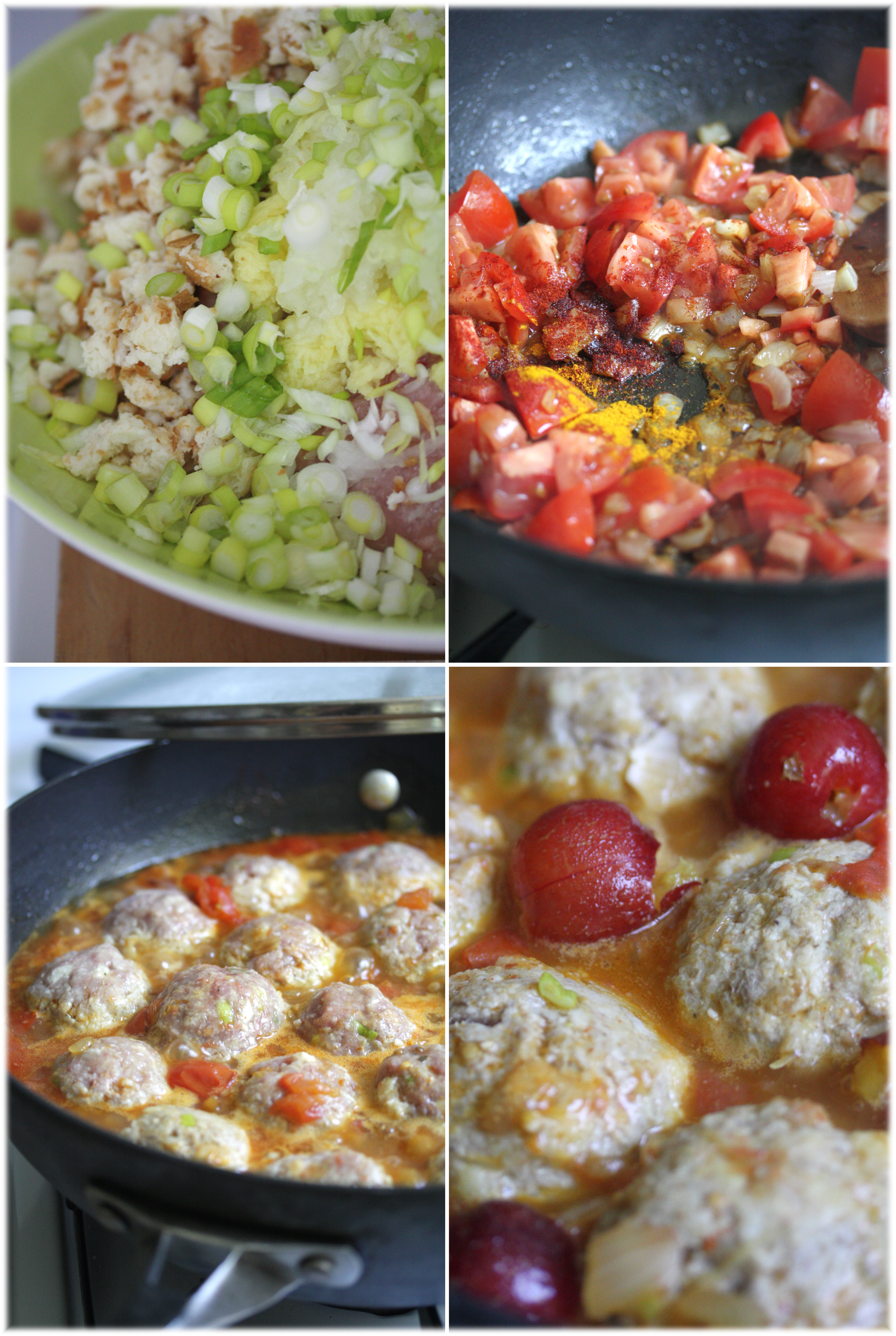 מזהיבים בצל בשמן, מוסיפים את השום ומטגנים כדקה נוספת. מוסיפים את עגבניות, תבלינים (אני אוהבת לפזר חלק מהפפריקה ישירות על הקציצות במהלך הבישול, בכדי שיקבלו צבע עשיר יותר) ושתי כוסות מים. מביאים לרתיחה ומבשלים כעשר דקות. יוצרים קציצות ומניחים אותן בעדינות ברוטב- גם כשנדמה שאין מקום, יש מקום. קציצות הן יצורים מאד חברותיים ואיכשהו תמיד יש מקום לכולן. פשוט מנענעים בעדינות את המחבת-סיר והן מתפקדות יפה.