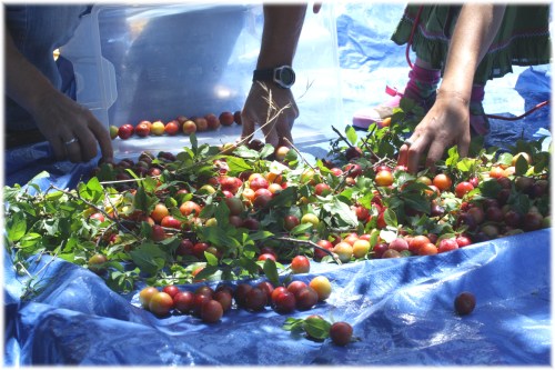 היוגיסטית תמיד מופתעת כשאני זוכרת את היומולדת שלה ומגיעה עם שקית של שזיפים וריבה עבורה אבל האמת היא שזו לא אני- זה העץ! עץ השזיפים הקטנים, שנהיה גבוה יותר ויותר בכל שנה ומקשה עלינו את קטיף פירותיו. השנה ניג'סתי כנראה מספיק חזק בכדי להביא הנה את משפחת הפלאחים לקטיף. הפלאחים הם חברים, אנשי טבע, אדמה וידע- שילוב מנצח ומועיל במיוחד במצבים שכאלו.