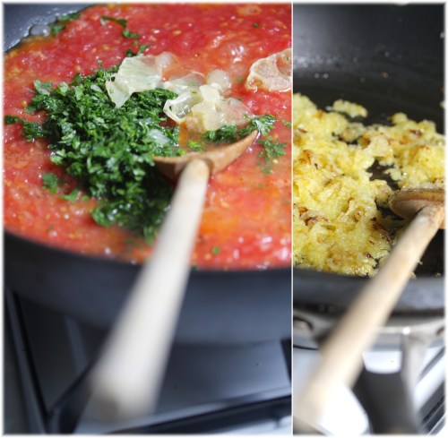 במחבת גדולה מחממים את השמן ומבשלים בו את הבצל המגורר כ-6 דקות עד שרך וזהוב. מוסיפים: עגבניות מרוסקות, פטרוזיליה, סוכר, מלח ופלפל ופרוסות לימון ומבשלים בבעבוע, מכוסה למחצה כעשר דקות.