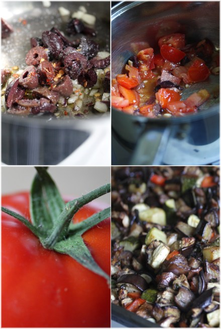 בסיר גדול מחממים מעט את שמן-הזית ומוסיפים שום, צ'ילי פלייקס, זיתים ומעט מלח. נזהרים לא לשרוף, מערבבים ומאדים מעט. מוסיפים את העגבניות והרסק  ומוסיפים את הירקות הצלויים. מוסיפים כ-1/4 כוס מים, מערבבים ומבשלים מעט  עד שמסמיך. טועמים ומתקנים תיבול.
