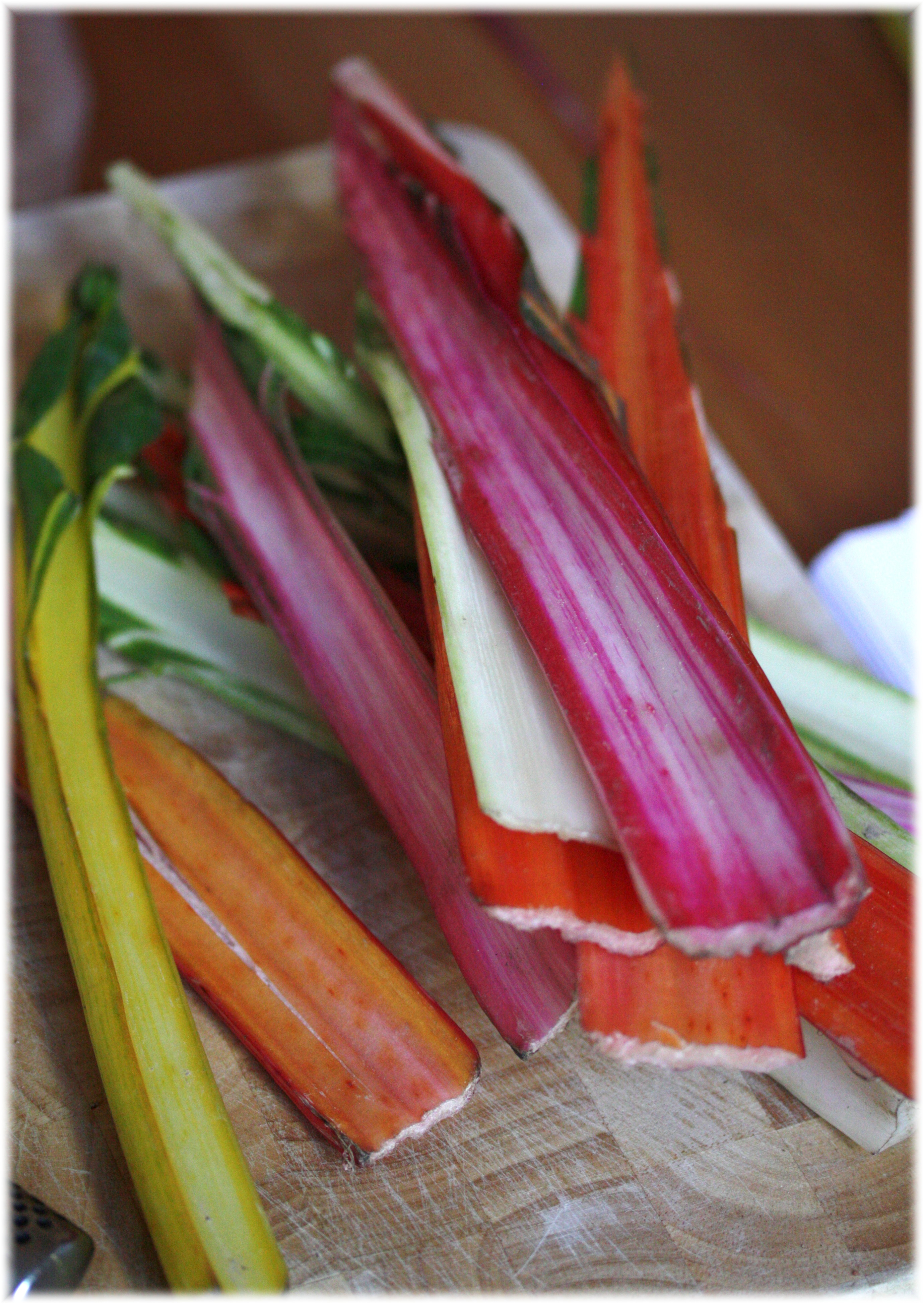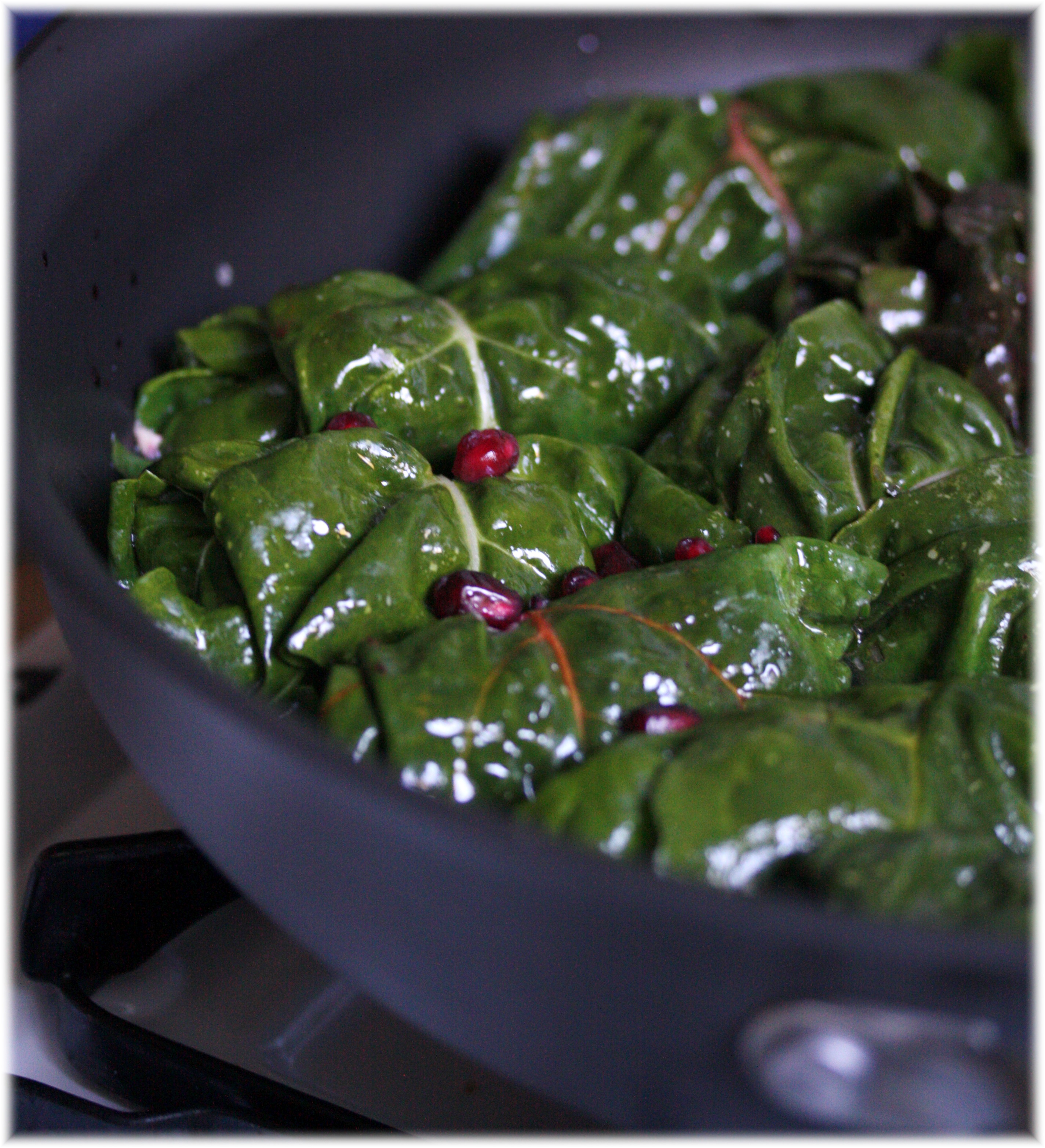 את הרימון המהמם הזה, קניתי בשוק האיכרים ממש לפני שרכשתי שלושה צרורות של מנגולד צבעוניים שקראו לי מהדוכן שלהם: 'הילה הילה אנחנו שלושה בחמש, אל תלכי!'. הם היו כל כך יפים שלא יכולתי להפנות להם גב. מהלם הכמות, שאלתי את ההיא בקופה מה היא עושה איתם. 'הכי טוב איתם פשוט שום ושמן-זית' היא אמרה. שום-שמן-זית אני יודעת כבר בעל-פה, לכן החלטתי על ממולאים וכמחוה לרימון המופלא ההוא שמעט ממנו נח על השיש ממש לידי, הם קיבלו קצת חמוץ וקצת מתוק ורוטב ורדרד-שקוף ועדין כזה. האיש ואני נהנו עד כלות.