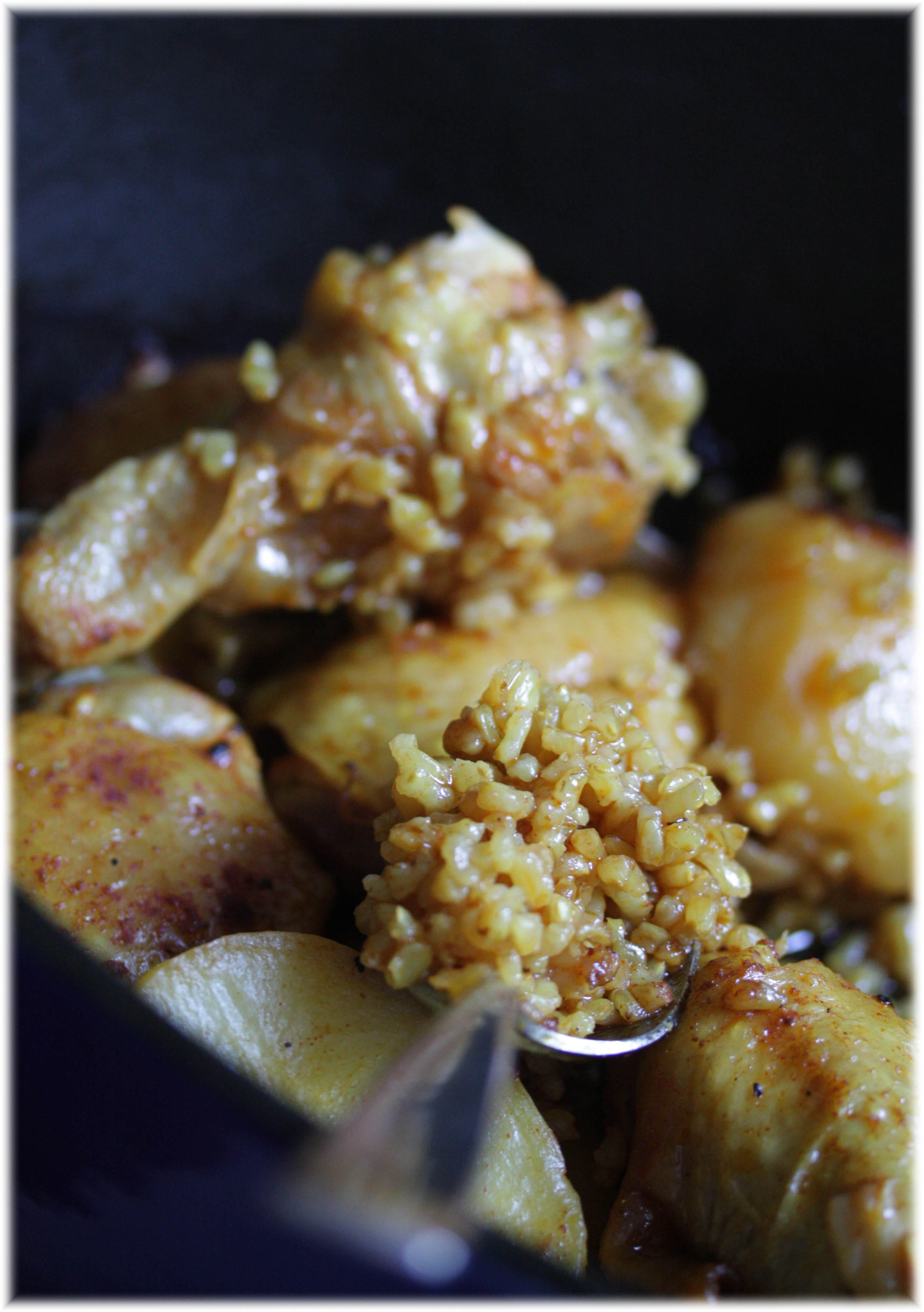 מחממים מעט שמן בסיר כבד ומזהיבים את הבצל בחום גבוה. כשהבצל מוכן, מוסיפים את האורז ושארית התבלינים ומערבבים היטב. מוסיפים לסיר את העוף ותפוחי האדמה ואת המים. נותנים עוד זירזוף מלח מעל ומביאים לרתיחה. כשרותח,  מכסים ומעבירים לתנור המחומם ל-60-70 דקות.
