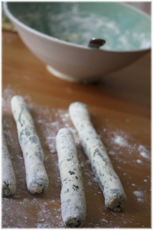 על משטח מקומח בנדיבות מגלגלים מהתערובת חמישה נחשים  בעובי של כ-1-2 ס"מ. לא ממש משנה- אתם תקבעו לעצמכם את גודל וקוטר הניוקי