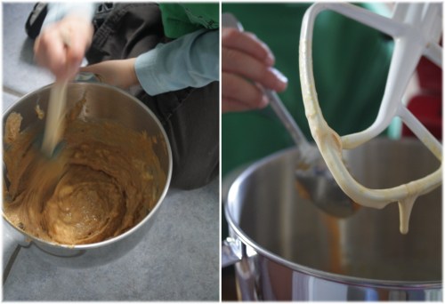 כשתערובת הביצים מוכנה, מנמיכים את מהירות פעולת המיקסר ומוסיפים לפי הסדר את: תמצית הוניל ,שמן- הזית, רסק התפוחים והבננות.