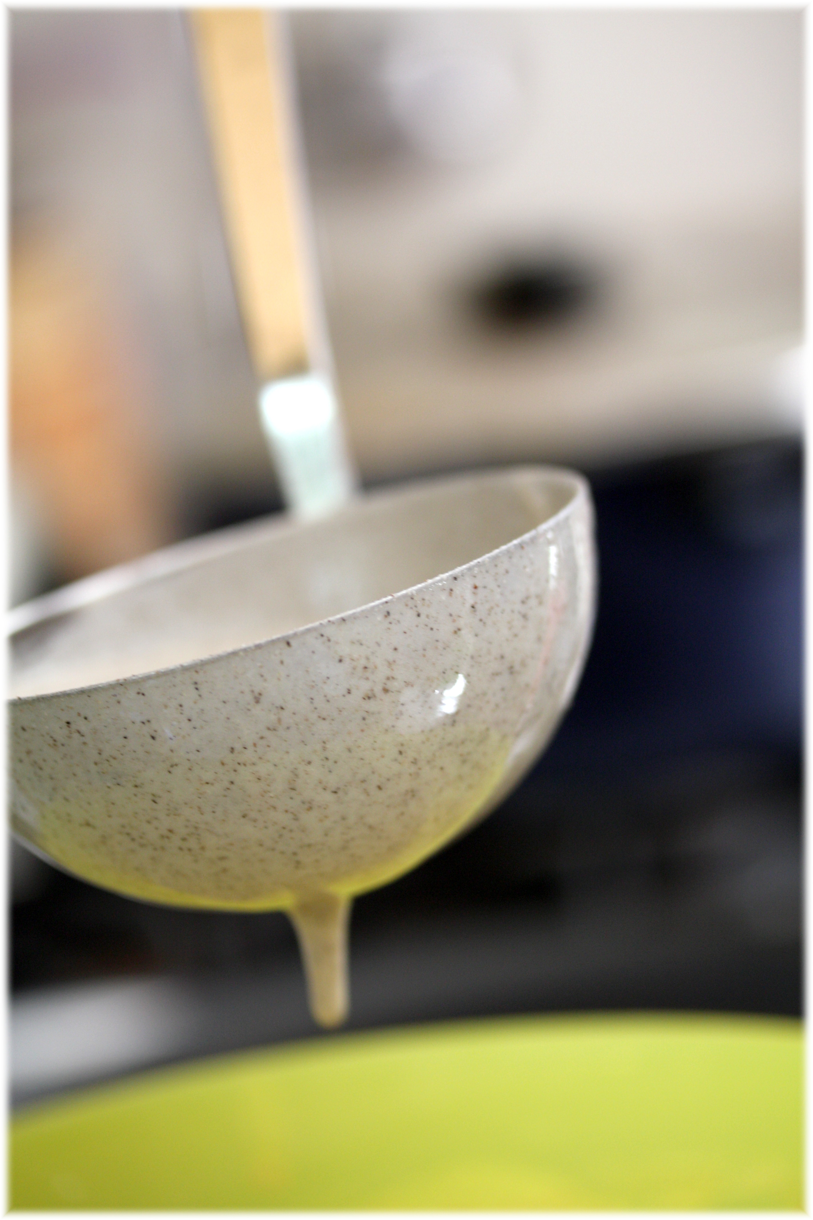 למי שאין מגרפה קטנה של קרפים (אני מתה על זה…) אפשר לפזר את הבלילה באופן שווה ע"י סיבוב של גב המצקת מבפנים החוצה (כמו שמורחים רוטב של פיצה). אם עובדים מהר זה יוצא מצוין.
