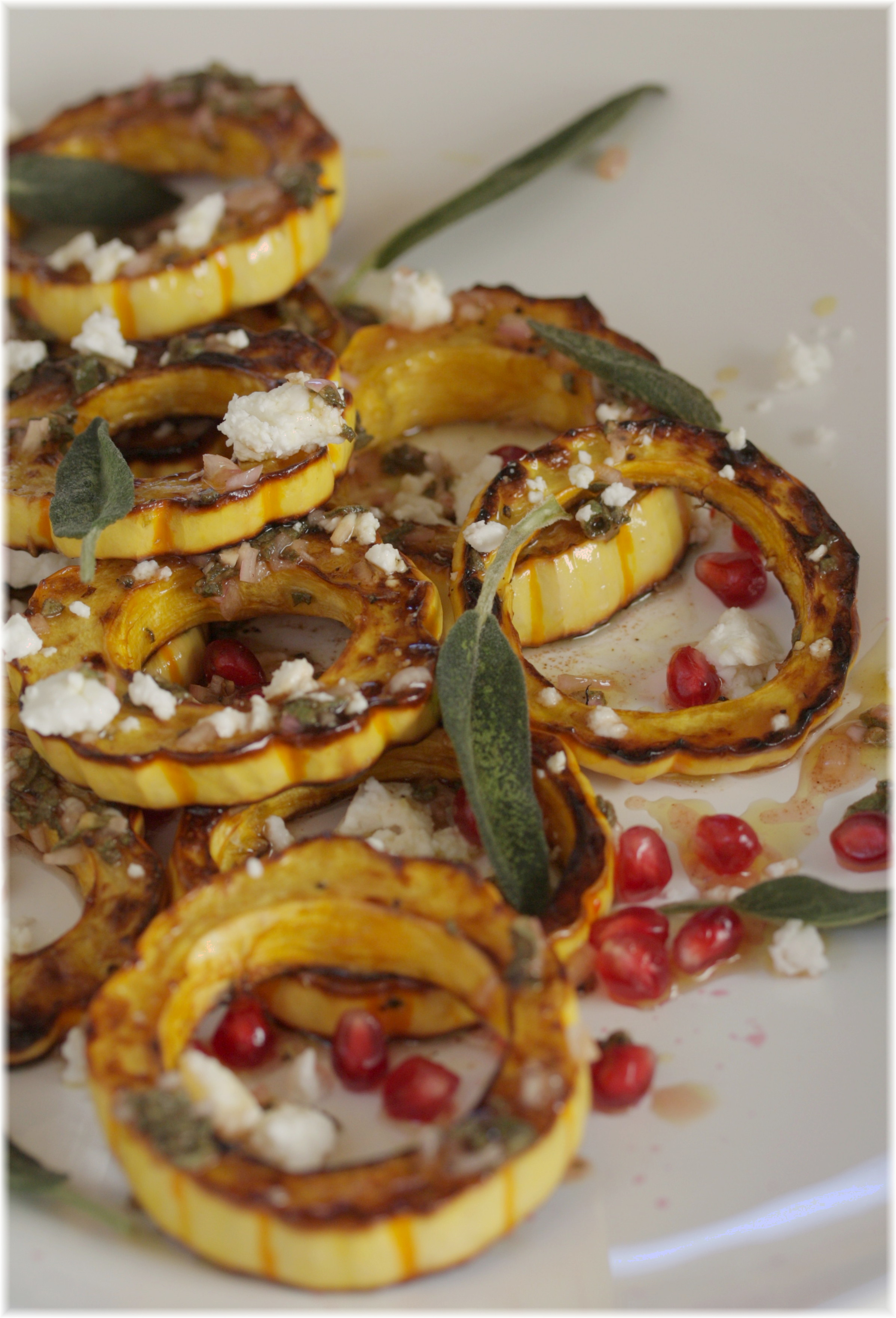 מניחים את הדלעת בצלחת הגשה, זורים מעל את גבינת הפטה המפוררת ואת גרגרי הרימון ומזליפים בנדיבות מהרוטב. ניתן להכין מראש.