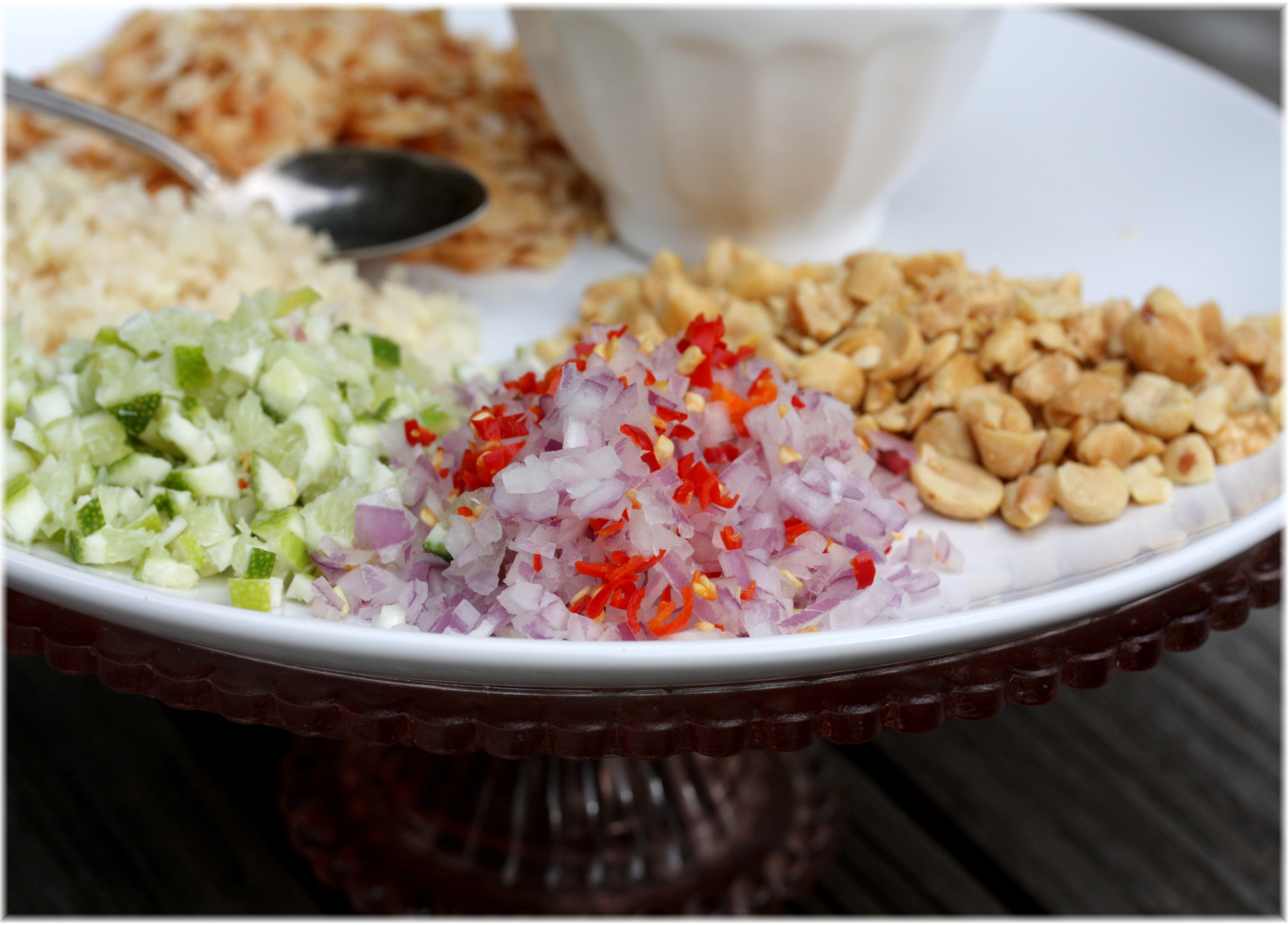 מגישים את כל המרכיבים הקצוצים על צלחת אחת (אני ערבבתי את הבצל עם הצ'ילי כמו שחדי עין בודאי ראו) ולידם את הרוטב והעלים.