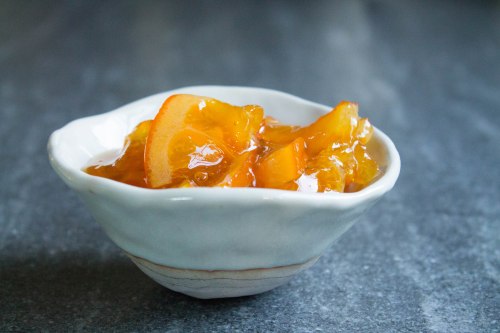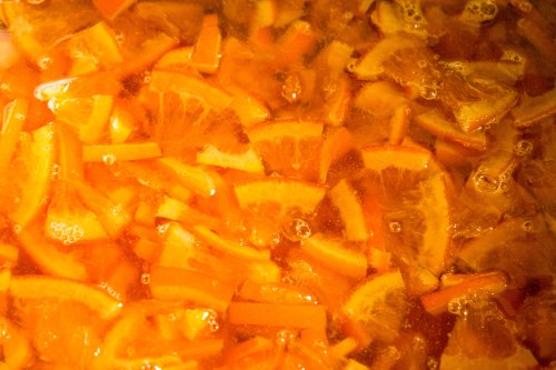 בזו עדיף לעצור מעט לפני מאשר מעט אחרי. בסיר, בשלב הזה, ישאר די הרבה סירופ סוכרי כתום. קחו בחשבון שהסירופ מסמיך מעט לאחר הקירור ושהוא משמש כעטיפה חלקה סביב פיסות התפוזים ולא כמסה קרושה שאמורה להחזיק את כל הפיסות יחד.