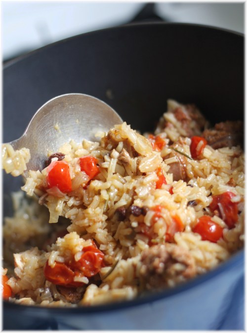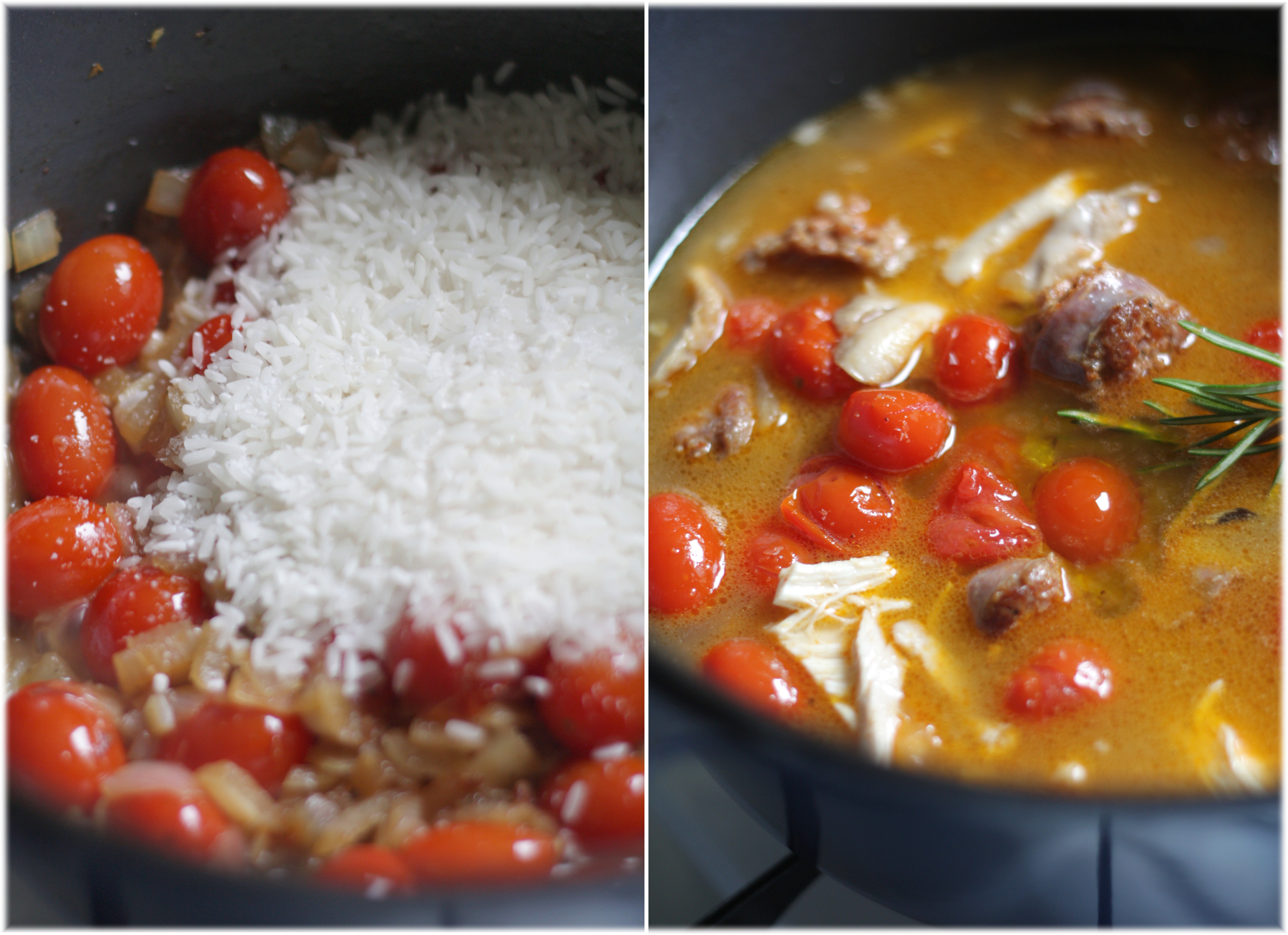 משחימים את חתיכות העוף והנקניקיה בכף שמן. מוציאים לצלחת. מוסיפים לסיר עוד מעט שמן ומוסיפים את הבצל ומעט מלח. מאדים כמה דקות ומוסיפים את השום ואת העגבניות מערבבים היטב. כשהבצל והשום רכים לתפארת, מוסיפים את היין ומצמצמים. מוסיפים את האורז, הבשר, הדמדמניות, מרק העוף והרוזמרין ומתבלים היטב. המים צריכים להיות ממש מלוחים. מביאים לרתיחה, מנמיכים את הלהבה, מכסים ונותנים לכל היופי הזה להתבשל על מי- מנוחות כ-20-30 דקות (לא שמתי לב!) עד שהכל רך, נפלא ומעט רטוב. זה לא אורז אחד אחד.