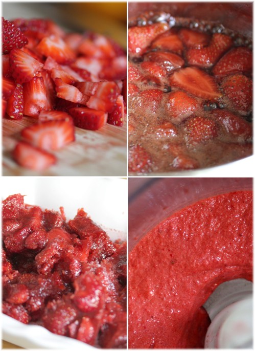 מכניסים לסיר מחצית מכמות התותים עם המים והסוכר ומביאים לרתיחה. מבשלים כחמש דקות בבעבוע עדין, תוך כדי ערבוב מפעם לפעם ומוסיפים את הבלסמי. לאחר חמש דקות בישול נוספות, כשהתותים רכים והנוזלים מסמיכים מעט, מורידים מהאש ומוסיפים את מיץ הלימון ושארית התותים החתוכים. מערבבים היטב ונותנים להתקרר.