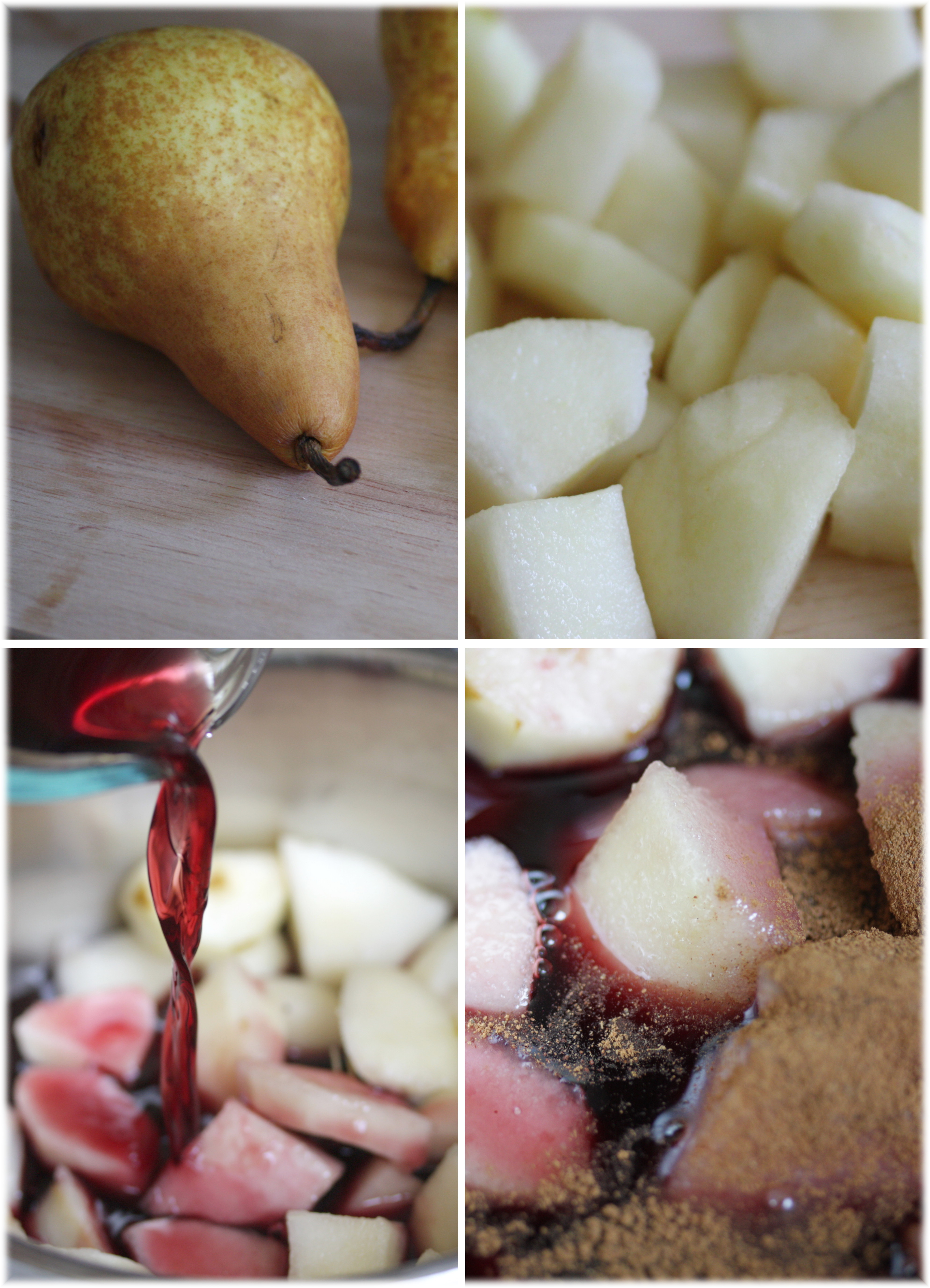 מביאים לרתיחה יין, מים קינמון וסוכר בסיר קטן ומוסיפים את קוביות האגסים. מבשלים כעשר דקות, עד אשר האגסים רכים, מוסיפים מיץ לימון ומקררים. מעבירים לכלי שטוח ורחב ומעבירים למקפיא.