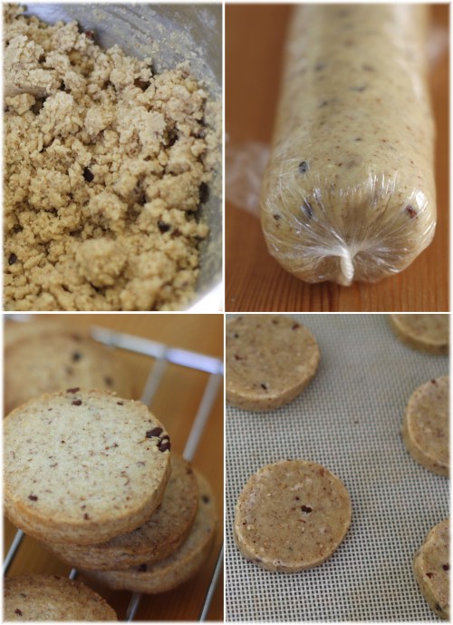 אוספים את הבצק לגוש אחד (בלחיצות), מחלקים לשניים, מגלגלים איכשהו כל חלק לגליל (לי התפרק קשות אבל בהחלט תלוי ברטיבות הבצק) ועוטפים בניילון נצמד. מקררים לפחות כשעה או עד כשלושה ימים. שימו לב ללחוץ היטב, בכדי שחללי האויר במרכז הגלילים יסגרו.