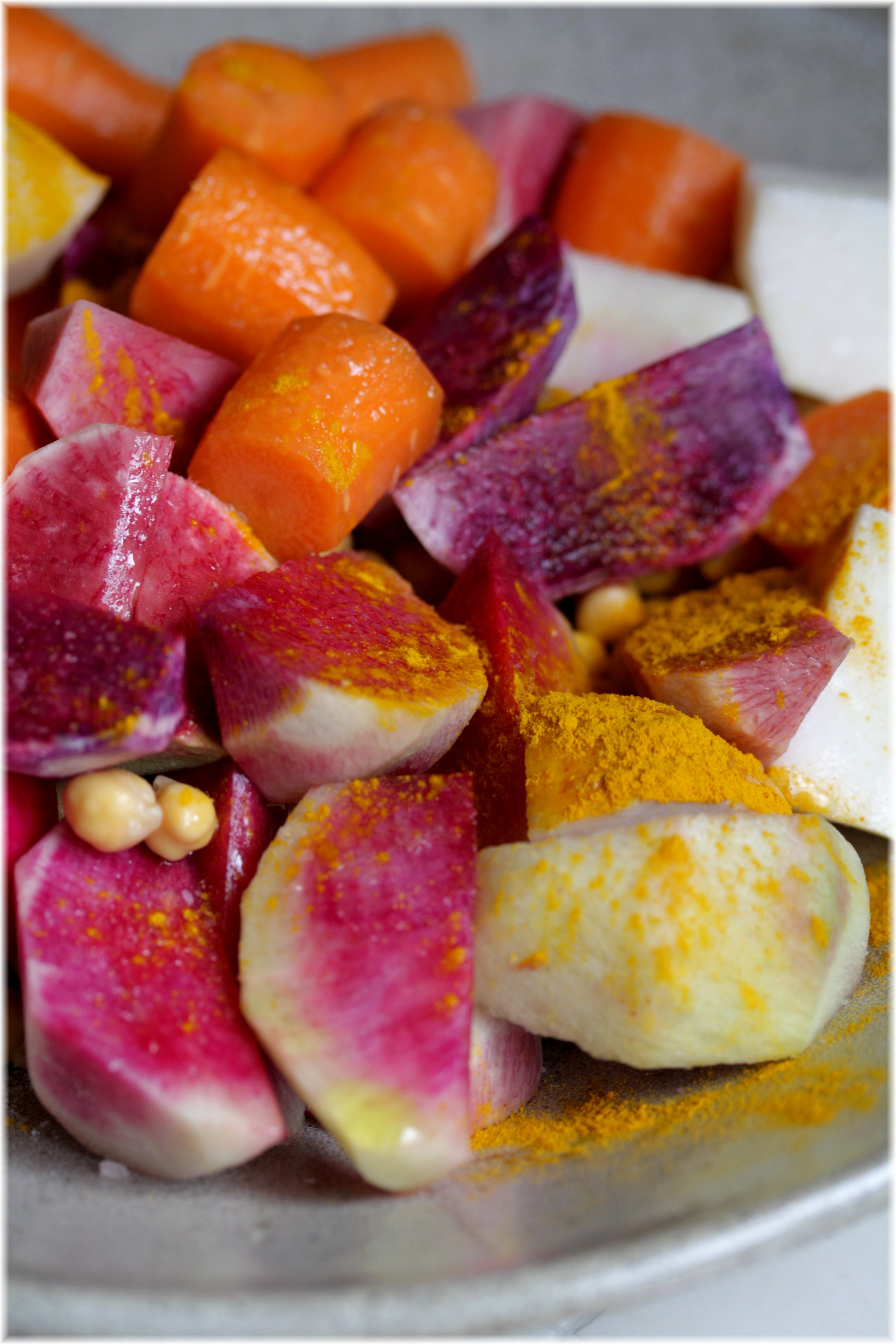 מקלפים את הגזרים וחותכים גס. מקלפים את הלפתות והקולורבי, חוצים ופורסים כל מחצית לשלוש פרוסות. חותכים את הצנוניות לרבעים.