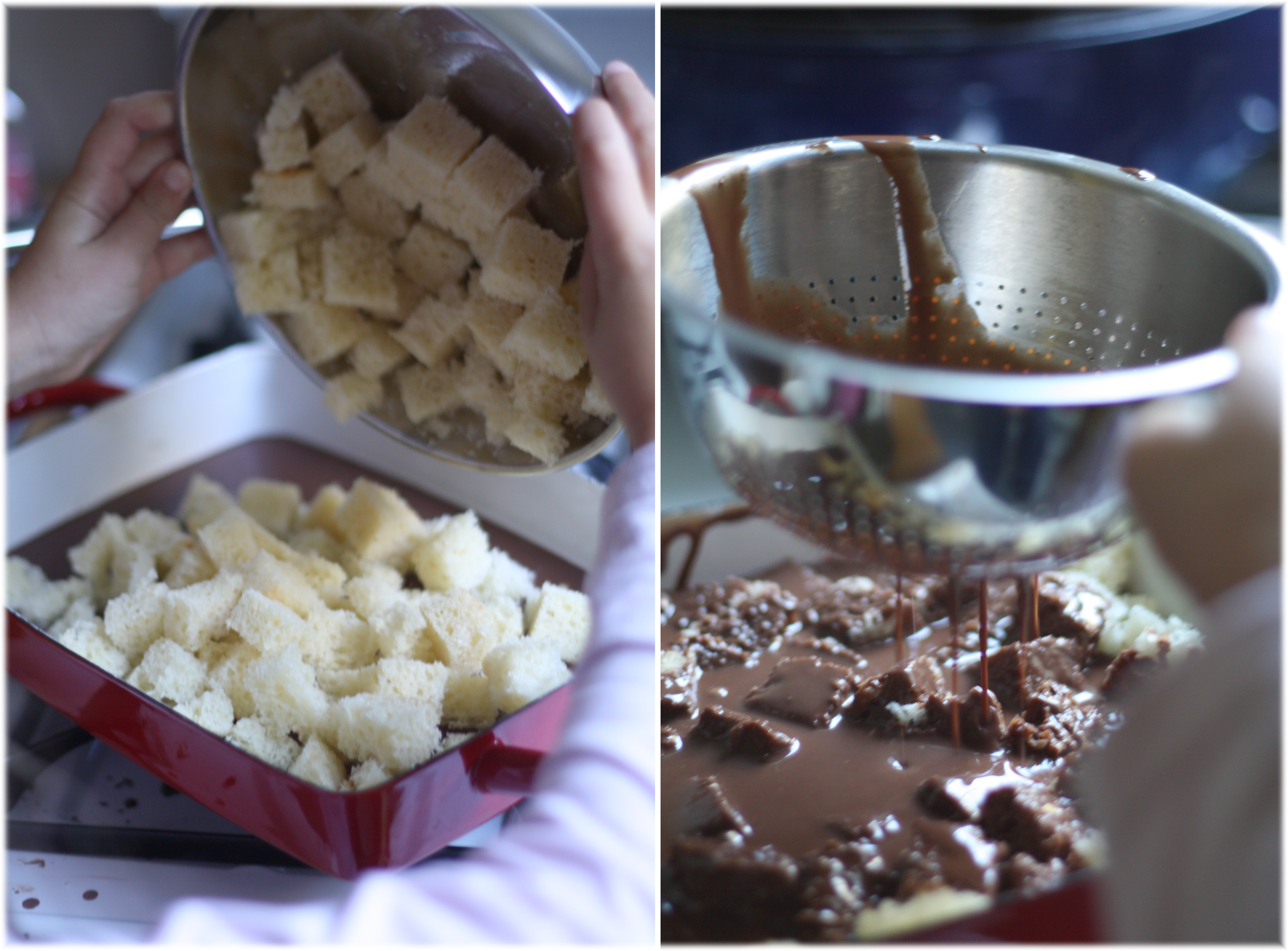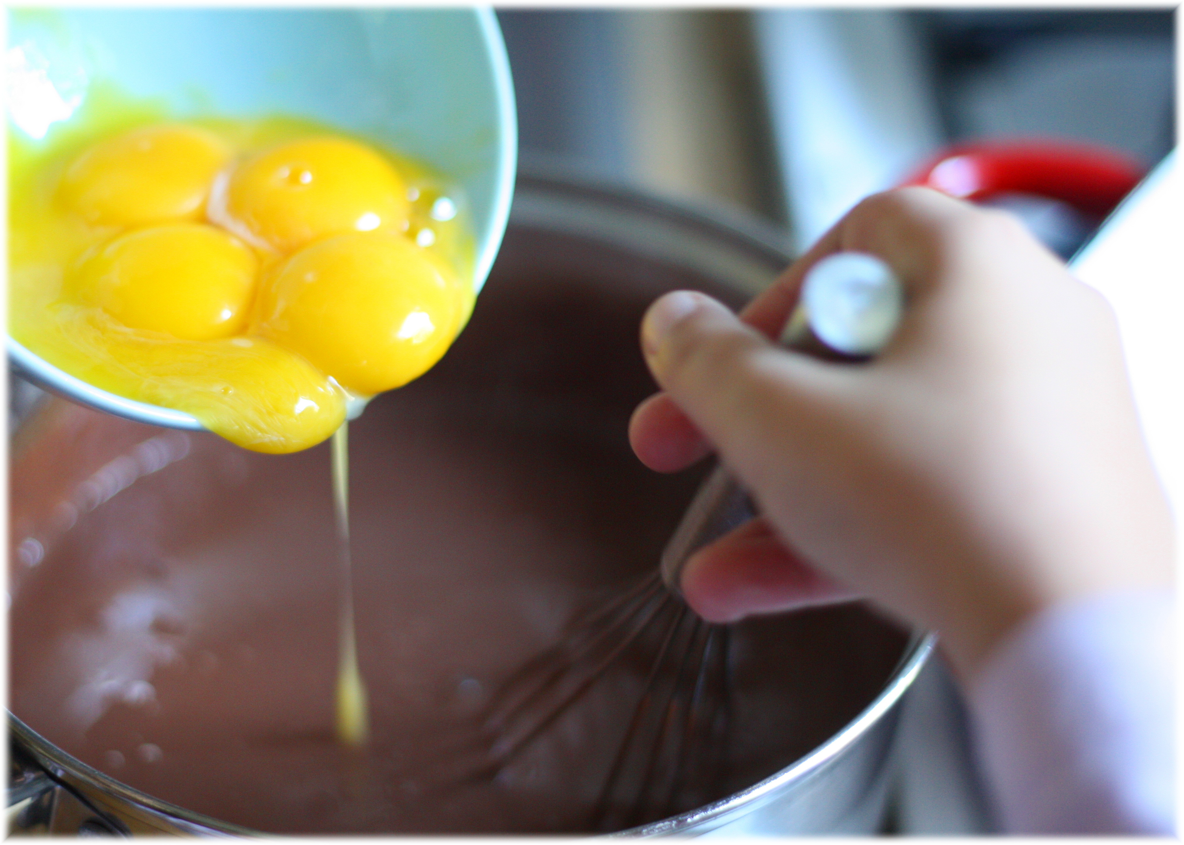 מפרידים את הביצים ומעבירים את החלבונים לקערת מיקסר. מקציפים במהירות בינונית- מהירה, עד אשר החלבונים מתחילים לקבל צבע לבנבן ומתחילים להוסיף את הסוכר בהדרגה. ממשיכים להקציף כשלוש דקות עד לקבלת קצף סמיך ולבן. מאיטים את פעולת המיקסר ומוסיפים לפי הסדר: חלמונים, שמן, קקאו, אגוזים ושוקולד ולבסוף את הברנדי. מערבבים עד שהתערובת אחידה ומעבירים לתבנית.